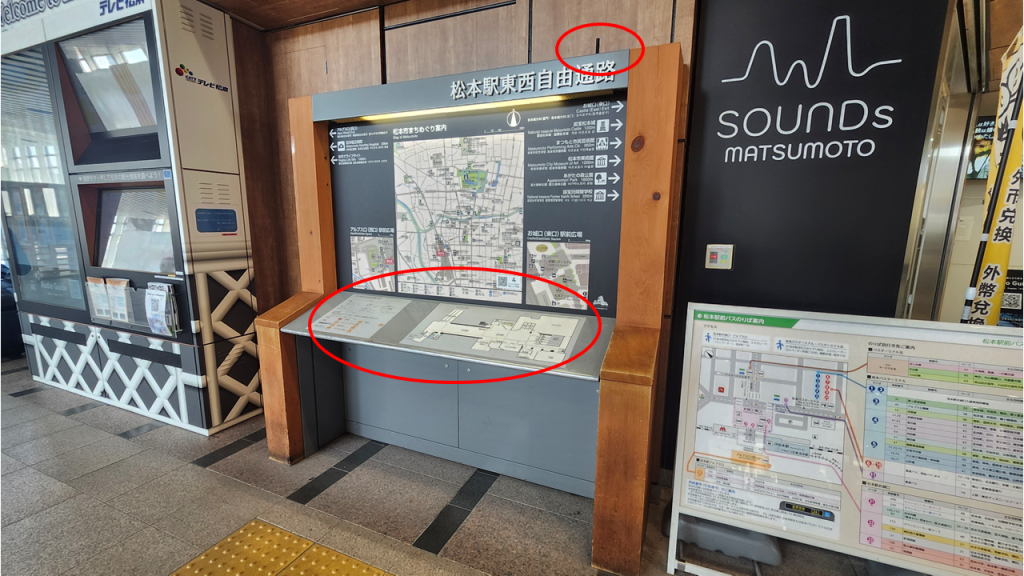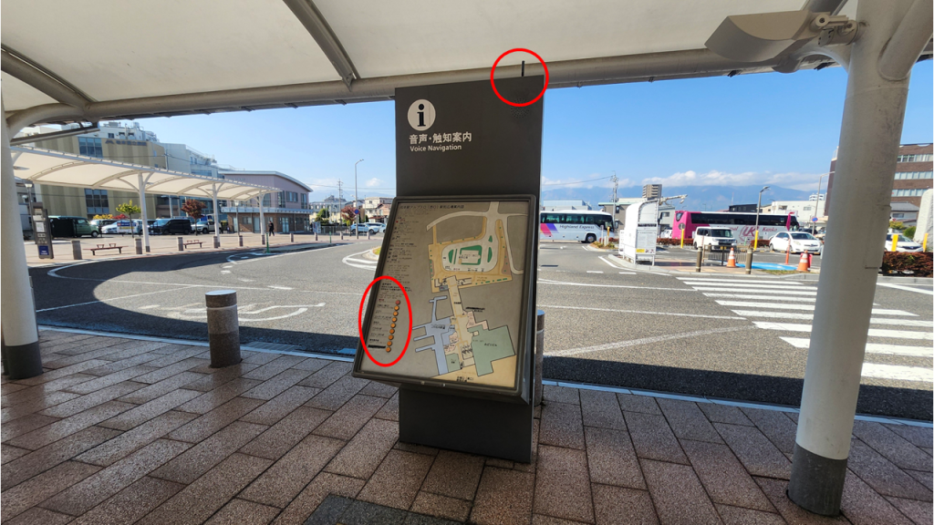 また、案内板のボタンをそれぞれ押すと、改札やトイレ、エレベーターのりばやバスターミナル等の位置を音声にて案内いたします。