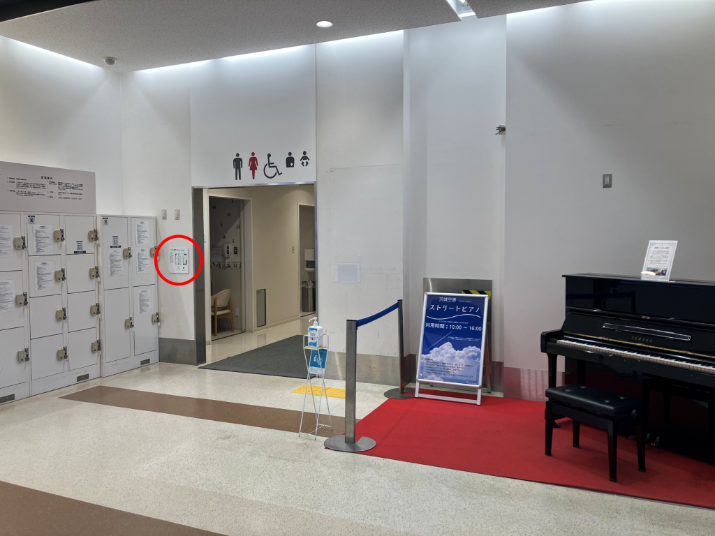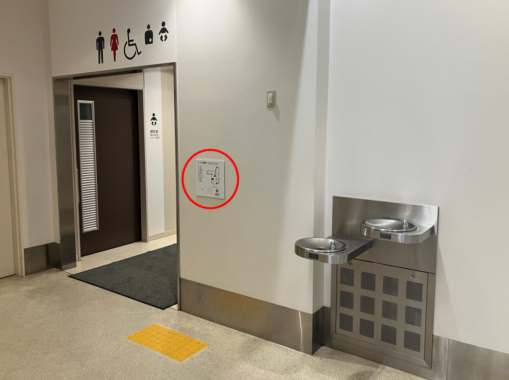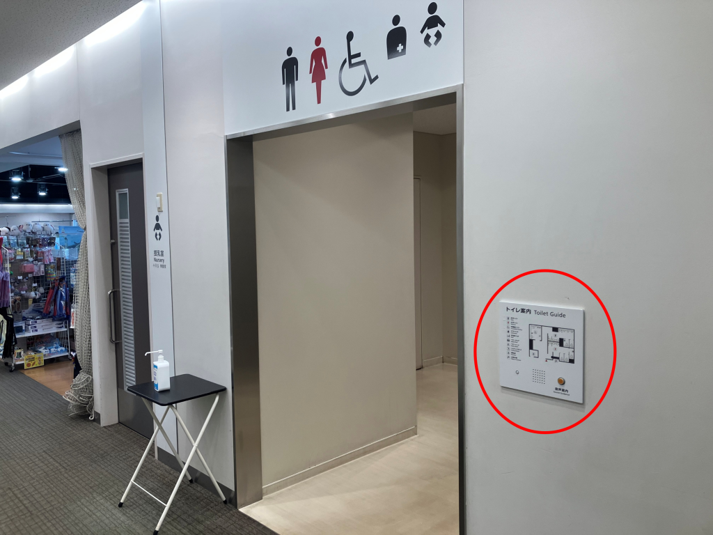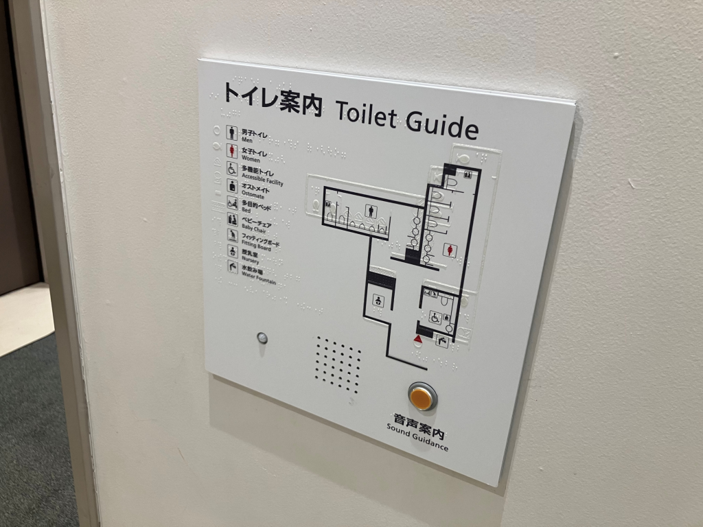 センサーに反応して、触知図案内板の位置を音声案内にてお知らせします。また、押しボタンに反応して、各トイレの方向を音声案内にてお知らせします。